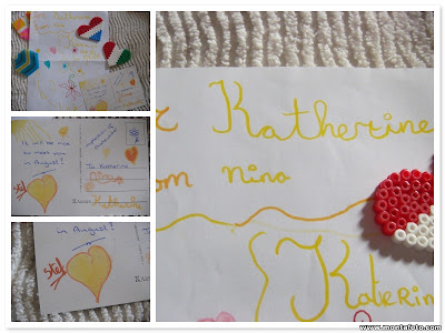 e tbm tinha: for Katherine from Nina, mais umas palavras em holandês (pelo menos eu acho), um cartão postal: It will be nice to meet you in august. (tinha até um coração escrito Stef) E .. umas coisinhas de plásticos, que deve ser de um brinquedo que formam corações em diversas cores .. um coração era com as cores ca bandeira da Holanda, outro parecia até da Itália, e outros bem coloridos.